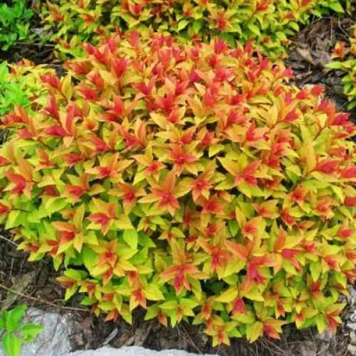 Спирея японская Голдфлейм (Spiraea japonica Goldflame)— компактный декоративный кустарник с полукруглой густой кроной, идеально подходящий для российских садов. Растение вырастает до 0,8 метра в высоту и формирует аккуратную декоративную форму, которая хорошо смотрится как в одиночных посадках, так и в групповых композициях. Молодые листья кустарника окрашены в медно-оранжевые оттенки, постепенно меняясь на зелено-жёлтые, что добавляет живой колорит саду в течение всего сезона.