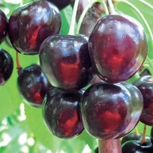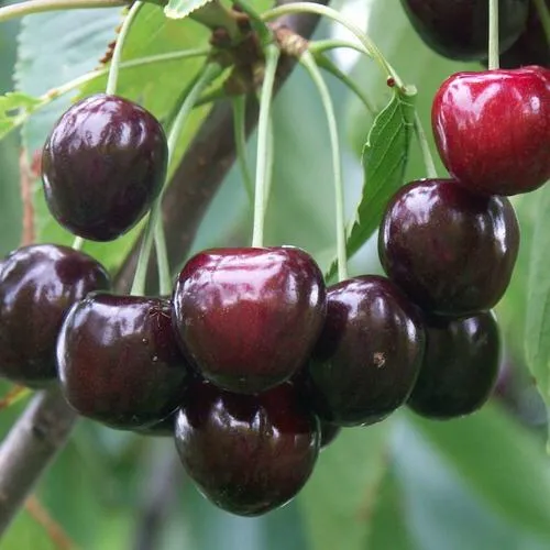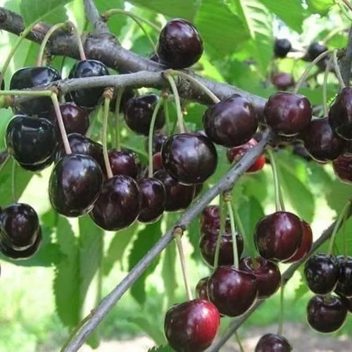 - Овальной формы, тёмно-красного, а при полной зрелости - почти чёрного цвета, сухо оделяются от плодоножки. Кожица тонкая, но прочная, глянцевая. Мякоть крайне сочная и мясистая, как и кожица, тёмно-красного цвета. Косточка коричневая, легко извлекается;