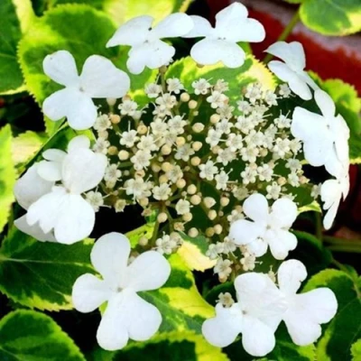Соцветия у черешковой гортензии плоские, щитковидные и достаточно крупные, диаметром до 15 см. Белые цветки придают кусту лёгкость и изящность, гармонично сочетаясь с пёстрой листвой. Цветение продолжается с июня по август и делает гортензию Миранда отличным решением для оформления солнечных участков, террас и балконов в условиях средней полосы России.